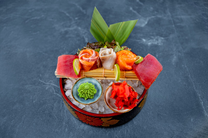 Consisting of 16 slices of raw fishes. This sashimi set is an artfully arranged platter of thinly sliced, raw fish and seafood, served with condiments like soy sauce, wasabi, and pickled ginger. The selection includes a variety of fresh, high-quality ingredients which are tuna, salmon, dorado, and Ishkhan (Armenian local trout).